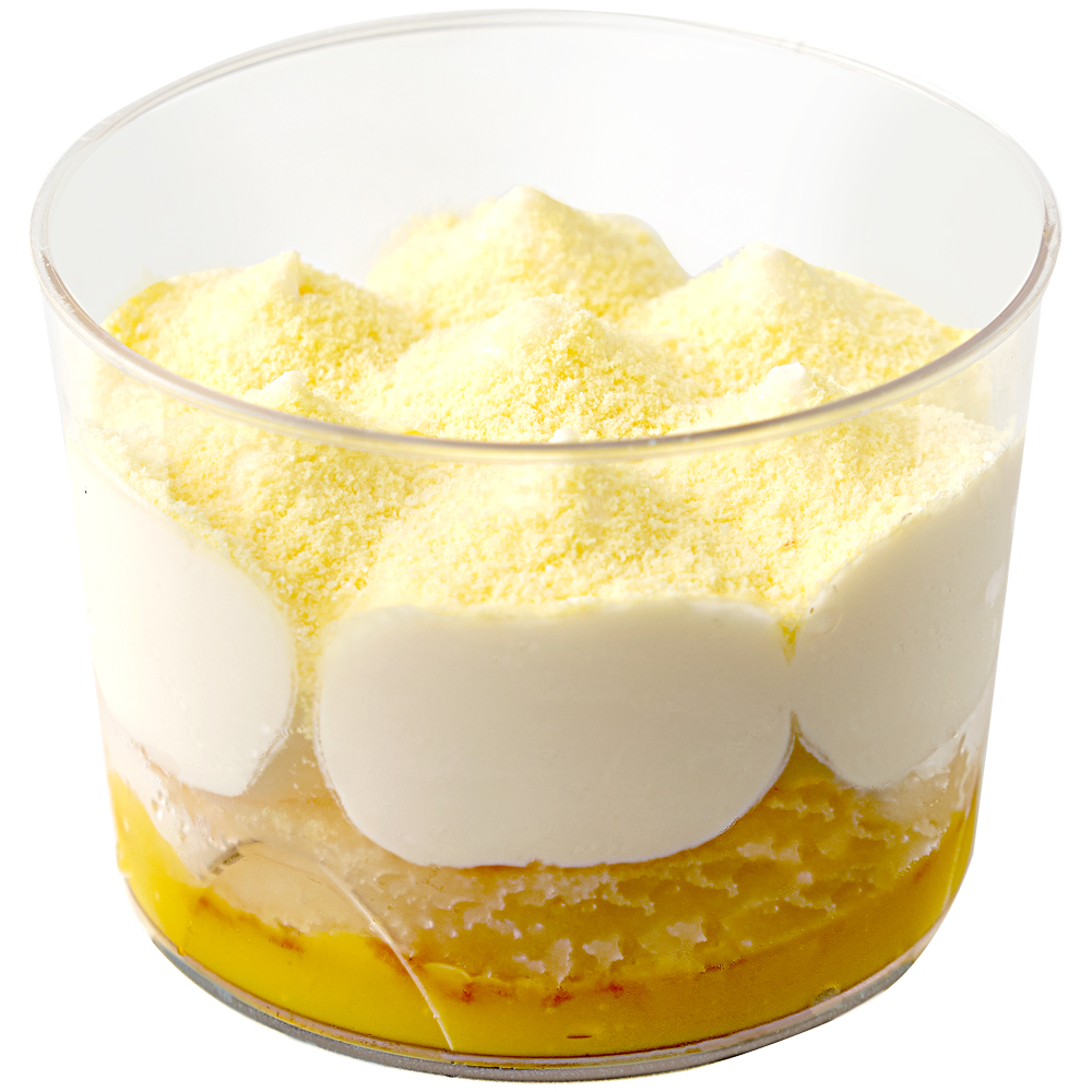 Яркий десерт с экзотическими фруктами: бисквит пропитанный сиропом, нежный сливочный крем, конфитюр на основе манго и маракуйя.